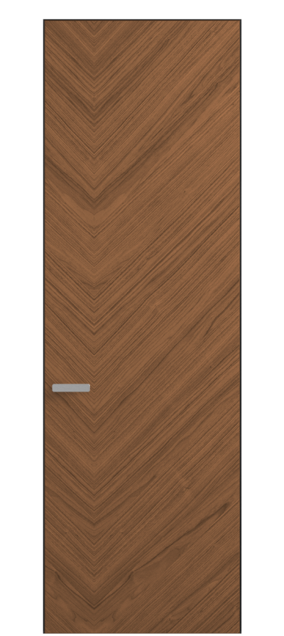 Полотно Рифт в скрытом алюминиевом коробе становится полноценным элементом декора. В коллекции представлено 9 моделей дверей в высоте до 3 метров. Рисунок раскладки шпона варьируется от простого до сложного. «Рубашка» для каждого полотна подбирается вручную по цвету, текстуре и фактуре.